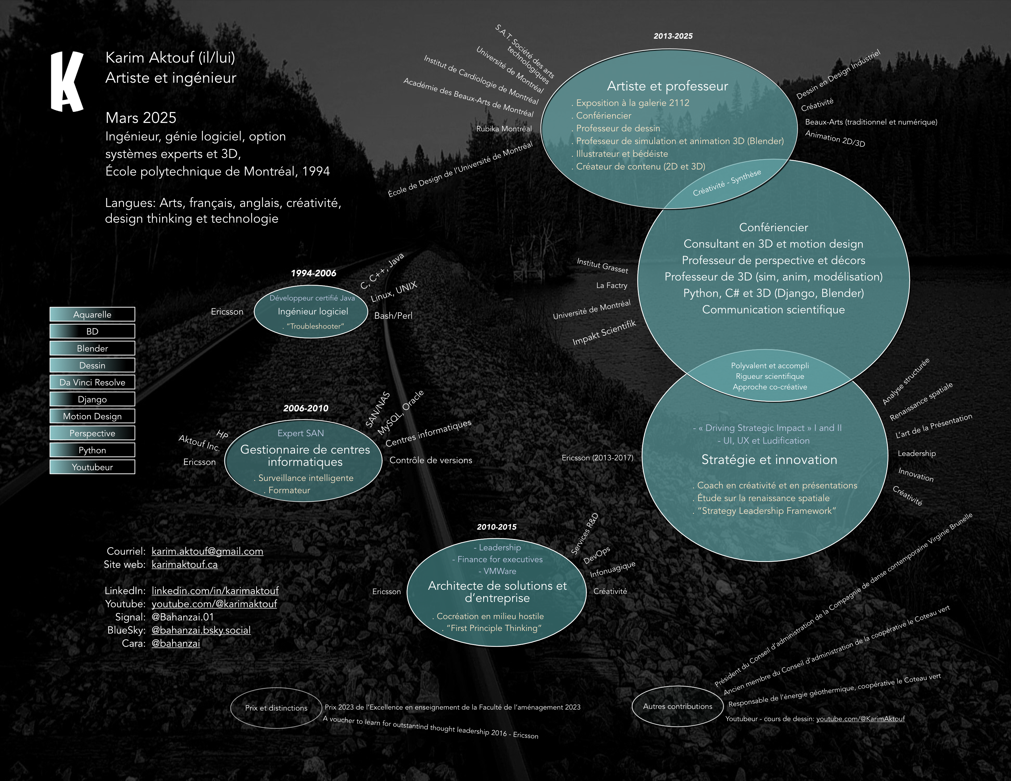 En 2017 j'ai tout arrêté pour étudier les beaux-arts à temps plein. Aujourd'hui ingénieur et artiste, je suis professeur à l’Académie des Beaux-Arts de Montréal. J'enseigne le dessin 1 et 2 à l'École de design de l'Université de Montréal.